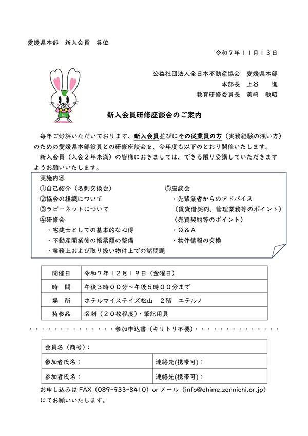 新入会員の代表者並びにその従業員(実務経験の浅い方)のために下記日程にて研修会を開催いたします。